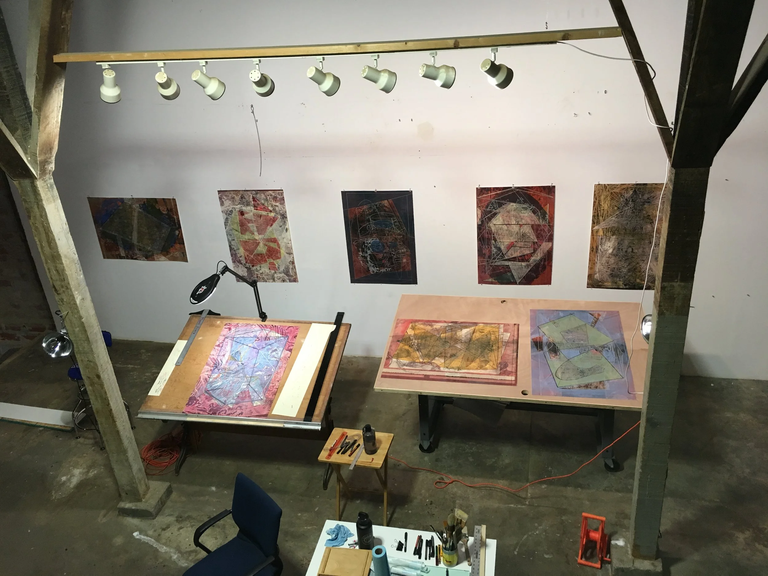 The studio o "Taller" is shaping up. It is a privilege to be able to display single pieces side by side and start seeing the connections. They are free from flat file darkness! The studio is located in the Studios Inc. in Kansas City, MO. USA o EEUUAA (Spanish abbreviation for USA)